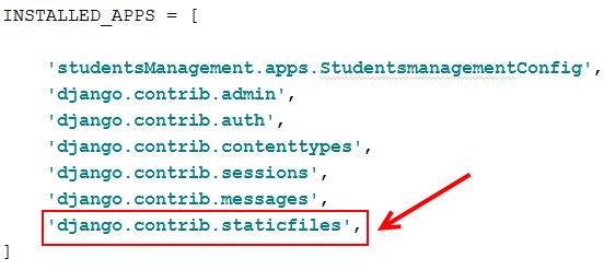 - Make sure that django.contrib.staticfiles is included in the INSTALLED_APPS list in the settings.py file: